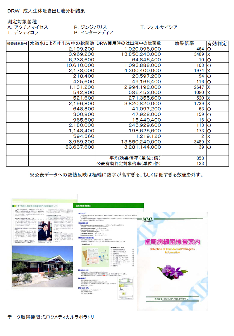 - 従来、染出しとコンサルを行って30~40分の時間を費やしてメンテナンスへの「動機付け」がクロージングできていたものですが、DrW300mlをプラスチックカップに6CC程度(ノズルで5~6プッシュ)をとって患者さんに30秒間の洗口を体験、その場で再度カップに吐き出していただき、汚れを視認いただければ充分なインパクトを与えることが可能です。患者さんの動機付けは勿論、スタッフの時間経費節減につながります。既に、ご利用いただいている医院のスタッフからは「何しろ自分の仕事が楽になった」「PMTCの成約率が上がった」と喜んでいただいております。